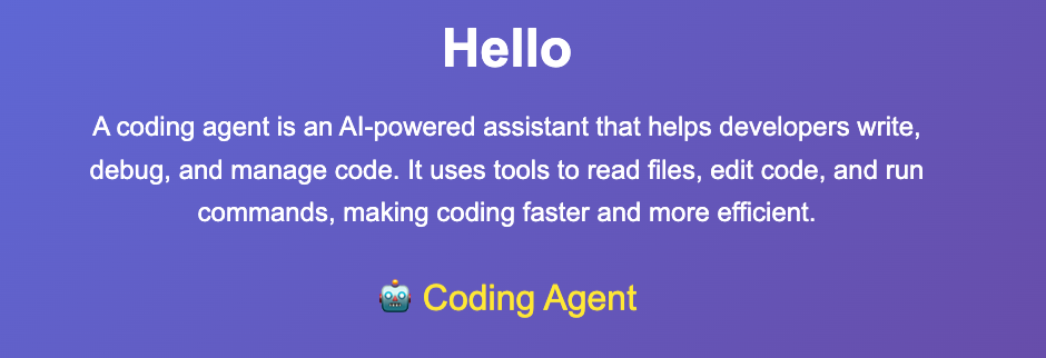 Assistant: I've successfully created the `hello.html` file. It includes a brief explanation of what a coding agent is (an AI-powered assistant that helps with coding tasks using tools like file reading, editing, and more), along with a nice animation: the title and text fade in smoothly, and there's a bouncing robot emoji to add some fun visual appeal. You can open this HTML file in any web browser to view it. If you'd like any modifications, let me know!